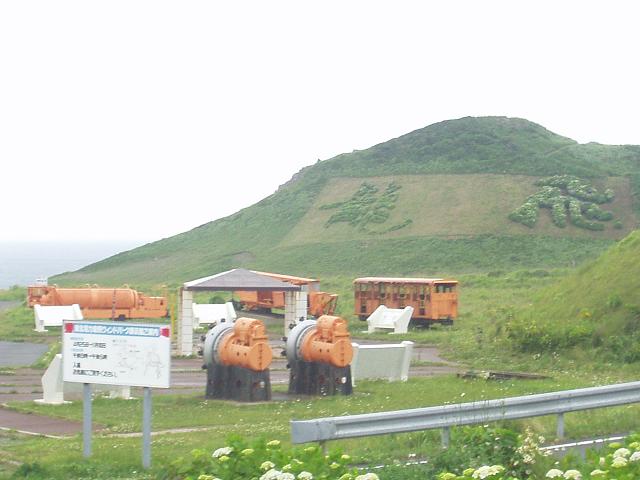 急な坂を上りいよいよ「青函トンネル記念館」へ。記念館前並べられた工作機械の向こうの山の斜面には大きく「龍飛」の文字が。
