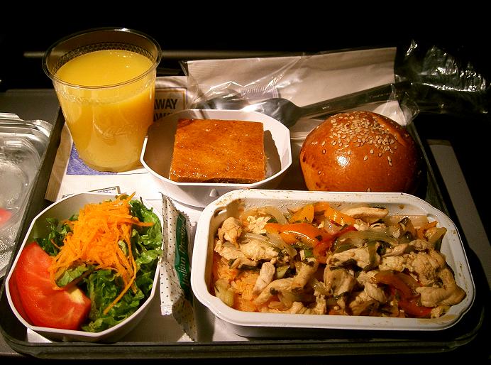 往路と違ってエコノミークラスでの搭乗となった復路では普通のプレートミールに。 それでもチキンとライスの取り合わせは味も質も悪くはなかった。 |