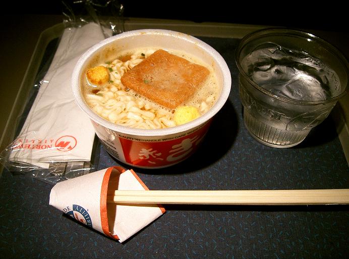 食彩に乏しいNW便でもさすがにフリーの間食は用意されていた。 JALほどオリジナリティはないが、カップ「うどん」は合格である。 しかし到着前のリフレッシュメントはまた最悪である。 まずメニューと中身が違う。さらに、メニューは3つの選択となっているのに なぜか二者択一を迫られる。それに対して何のエクスキューズもない。 選んだオムレツも、具がポテトといかにもアメリカらしいハイカロリー食だった。 |