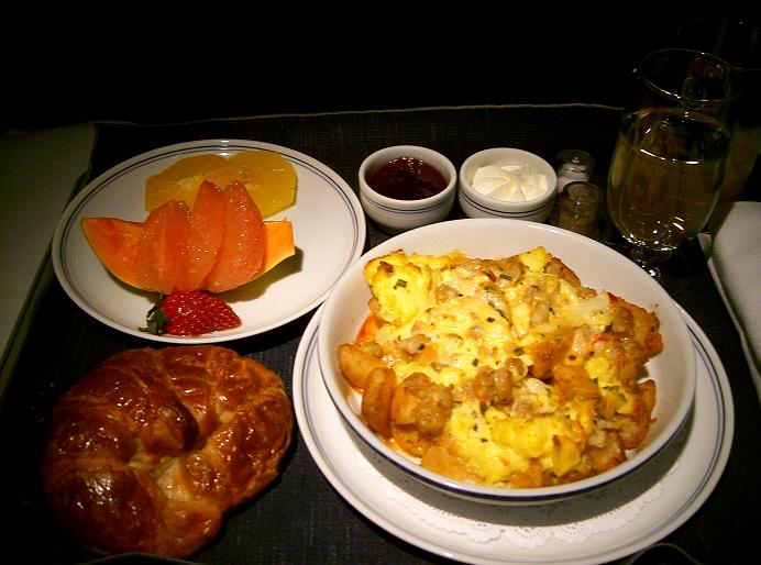 ビジネスクラスの食事を酷評させて頂いたノースウェストだが、 意外なことにエコノミーが割とまともだった。無論、もともとのレベルそのものは低いが、 ビジネスと比べると格段にコストパフォーマンスは高かった。 機内食は全て試すことをモットーにしているが、夜中のリフレッシュメントを 寝ていて逃してしまったのが悔やまれる。 ヤラレタのが朝食の”アジア風フライドヌードル” 何のことはない屋台の焼きそばだった。 (確かに日本のものでも”アジア風”には違いないが・・・) |