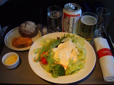 3度目の正直、やっとビジネスクラスへのアップグレードができ、 念願だったシェルフラットシートに座ることができた。 ビジネスの食事も少しは改善されたか?と期待したが、 結果は大して変わらず。唯一よかったのはオードブルのみ・・・ |